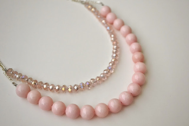 I made a two layer pink necklace with solid color pink shiny beads to create very subtle drama...