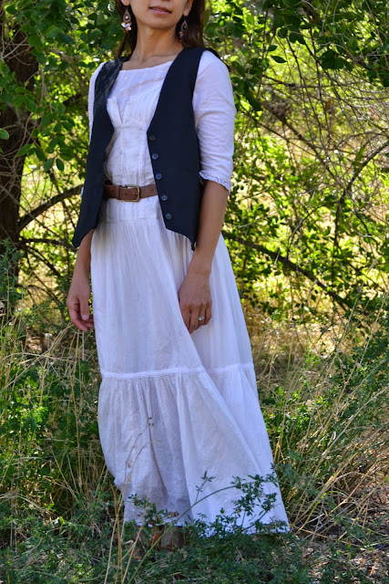 For example, wear it over a pinstriped shirt (made out of very light weight cotton). Wear it with dark charcoal dress- the vest won't stand out, but it is still there... I think the subtle difference is nice. I can button it up and wear it under a jacket in fall and winter. I am planning to wear this all year long! But today, I am wearing it with a cream colored dress and brown belt. It is perfect for the end of summer beginning of fall weather.